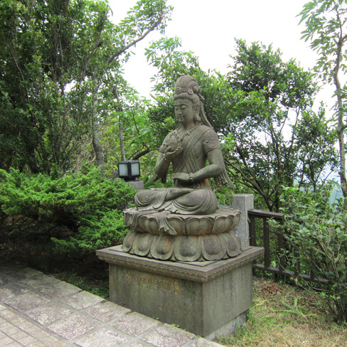 A partire dall’entrata si snoda un sentiero verso sinistra che porta al terrazzo di Guanyin, dove troneggia l'enorme statua di questo bodhisattva. I bodhisattva sono coloro che sono a un passo dal raggiungere il nirvana, ma che vi rinunciano per aiutare tutti gli altri esseri viventi a raggiungerlo. Guanyin il più famoso dato che rappresenta la compassione. La sua statua nera e dorata è talmente imponente che può essere vista da lontano, forse la avete notata anche voi salendo alla montagna. Dalla parte opposta rispetto alla statua noterete una sorta di guglia dorata: essa è la statua del Guanyin a undici facce, ognuna di esse rivolta in una direzione diversa, a simboleggiare che la protezione del bodhisattva si estende ovunque.